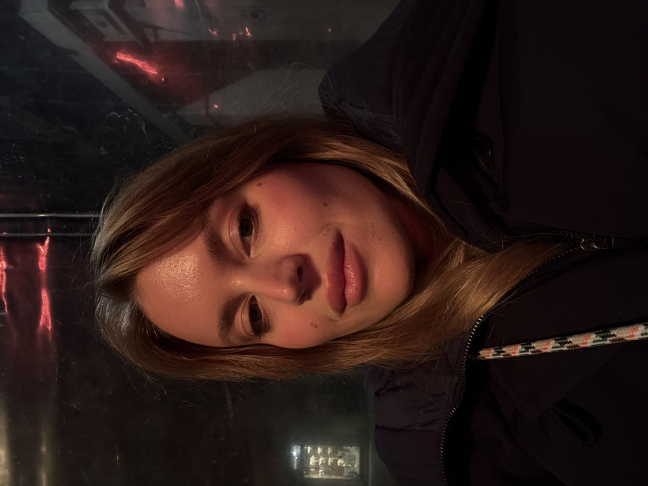 A blonde woman poses at an angle, wearing a dark puffy jacket with a multicolored drawstring. Her face is illuminated, highlighting her lips and eyes. Light reflects in the background, blurring shapes, suggesting she is indoors near a reflective surface. The image is taken from a slightly elevated perspective, focusing on her face and upper body.