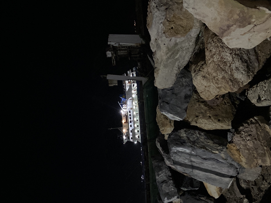 A ship is docked, illuminated against the night sky. The vessel's structure is multi-level, with visible windows and lighting. Rocks are positioned along the foreground, varying in color from gray to tan. The overall composition is a contrast between the artificial lights of the ship and the natural textures of the rocks, with darkness filling the negative space. The viewpoint is slightly askew.