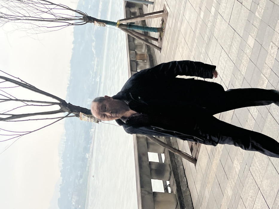 The image displays an outdoor scene along a riverside promenade in Jiangjin, China. In the foreground, an elderly male subject, of East Asian descent, is centrally positioned. He has a bald head, a neutral expression with a slightly open mouth, and is wearing a dark, zipped jacket over a dark, patterned shirt, along with dark trousers. He stands on a light-colored, rectangular-tiled paved walkway. Behind him, a grey stone balustrade extends horizontally, separating the walkway from a wide, calm body of water, presumed to be the Yangtze River or a tributary. Two slender, deciduous trees with bare branches stand on the promenade behind the man, each supported by wooden stakes wrapped in green material and bearing small, rectangular tags. In the hazy background across the river, indistinct hills and scattered structures are visible. A small, reddish boat is present on the river in the left-center, and a larger, darker vessel is further to the right. The scene is under diffused, hazy daylight, suggesting an overcast sky or atmospheric conditions.