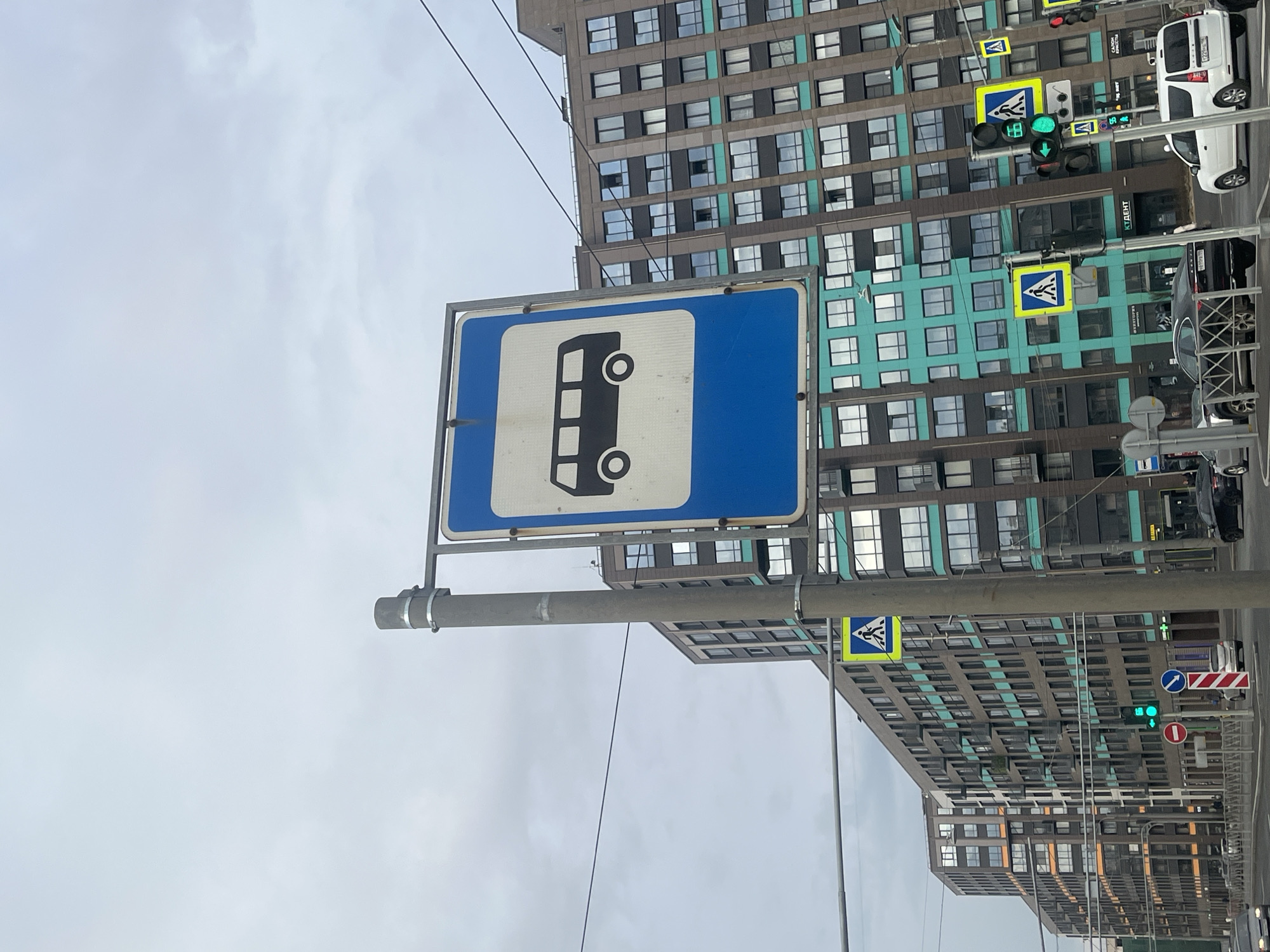 bus stop sign in Saint Petersburg, Russia. The sign is blue and white with a black silhouette of a bus. The background includes a tall, modern building with numerous windows, as well as traffic lights showing green. Other street signs related to pedestrian crossings are also visible. Cars are parked on the street. The sky is overcast.