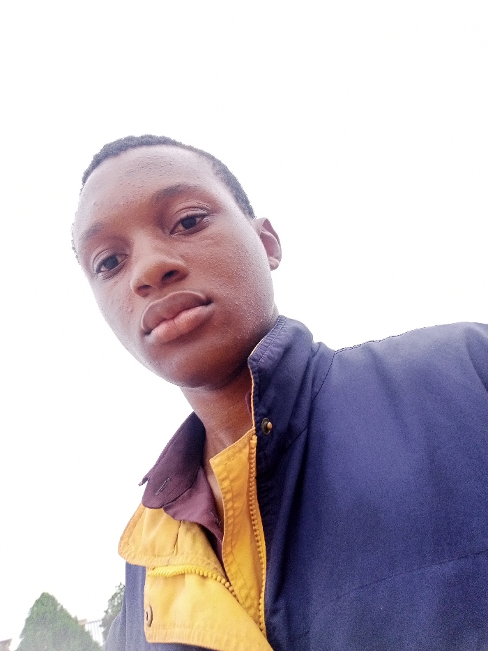 A young male individual is depicted in a low-angle, close-up portrait, positioned against a bright white, undifferentiated background with minimal dark green foliage visible in the lower left. The subject has dark skin, short dark hair, and maintains direct eye contact with the camera, exhibiting a neutral facial expression. He is dressed in a dark blue jacket, unzipped, revealing a yellow-collared, zippered layer underneath, with a dark red or maroon shirt collar visible below that. A brass-colored snap button is present on the dark blue jacket's collar. The scene is located in the city of Ukwu-Abwa, Nigeria.