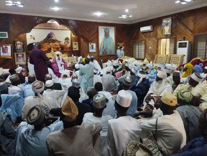 room in the Emir's Palace in Kaltungo, Nigeria, at coordinates (latitude: 9.816, longitude: 11.315). There are many men sitting on the floor, and the room is crowded with people. The men are wearing white robes, white caps and some are wearing white gowns. The room is decorated with wooden panels on the walls. There are framed photographs on the wall, and some of the photographs depict men in traditional robes. There is a large painting on the wall that appears to depict a man in a white robe. There is a large, open space in the center of the room. The men are sitting in a circle and appear to be discussing something. They are all looking at the person speaking. One man is standing in the center of the room and is speaking to the group. He is wearing a burgundy robe and his hands are clasped in front of him. He appears to be leading a discussion. The room is lit by light fixtures.