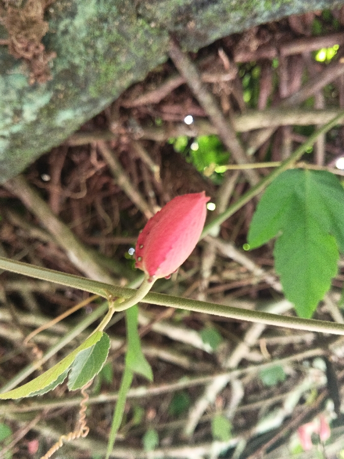 The image displays a close-up view of a vibrant red, ovoid fruit or bud, approximately 2-3 cm in length, featuring small, raised, light-colored bumps near its base. It is attached to a slender green stem or vine, from which a small green leaf and a coiled tendril extend to the lower left. A larger, broad green leaf is situated to the right of the red object, also on a stem. The background consists of a dense, out-of-focus array of intertwined brown branches and green foliage, with bright highlights indicating filtered sunlight. A moss-covered log or thick branch is visible in the upper left of the frame. The scene is a natural outdoor setting, devoid of human presence or man-made objects, located in Masulog, Philippines.