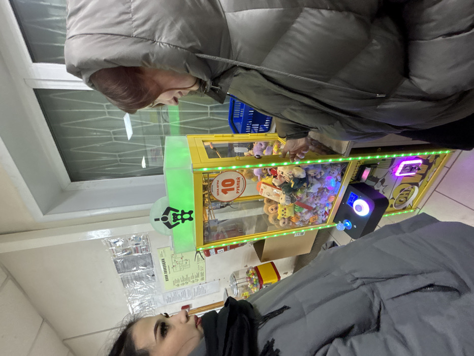 Two females are depicted in an indoor commercial environment in the city of Фоки, Russia, situated near a claw machine
