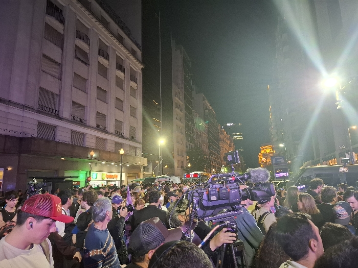 The image depicts a densely packed urban street at night in Buenos Aires, Argentina, characterized by a large public gathering and prominent media presence