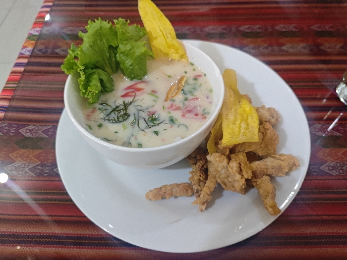 A white bowl filled with a creamy, white-colored soup sits on a white plate. The soup contains green herbs and red bits of vegetables. A green lettuce leaf is on the rim of the bowl, along with a yellow, curved plantain chip. Next to the bowl, there is a pile of fried strips. The plate rests on a tablecloth with red, brown, and tan stripes.