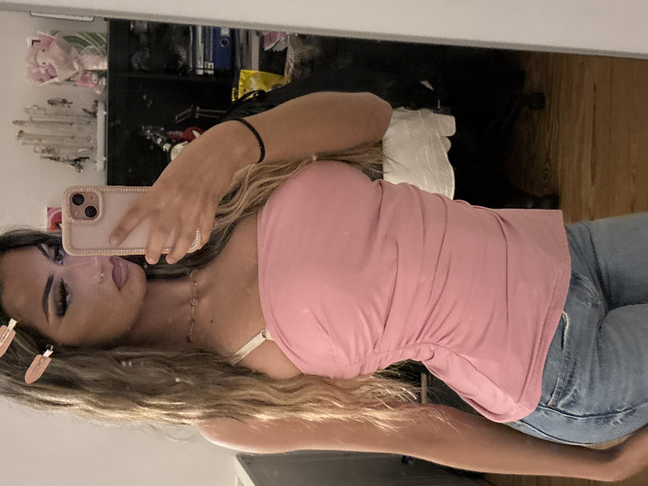 A young woman takes a selfie in a mirror, holding a pink-cased phone. She has long, wavy blonde hair with pink clips, and wears a pink top with blue jeans. Her makeup is prominent, featuring heavy eyeshadow and lip color. Behind her is a shelf with various items, including books and decorative objects. A black object and a white object sit on the shelf behind the woman.
