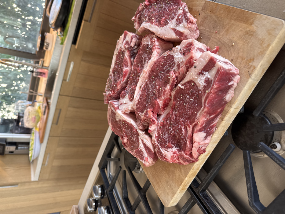The scene is located in a modern kitchen within the Mevoot HaHermon Regional Council, Israel. The primary subject is a collection of approximately eight raw, thick-cut steaks, likely beef, seasoned with coarse salt and black pepper flakes, resting on a light-colored wooden cutting board. The steaks exhibit prominent marbling and lean red muscle tissue. The cutting board is positioned on a stainless steel gas stovetop, with black grates and three metallic control knobs visible on the left side. In the blurred background, a contemporary kitchen setup is discernible, featuring light-toned wooden cabinetry and a light-colored countertop. A stainless steel kitchen sink with a faucet is centered in the background. To the left of the sink, a white bowl holds green leafy vegetables, and a yellow cutting board or mat is nearby. To the right of the sink, a dark, lidded pan and another dark container are present on the countertop. A large window behind the sink reveals blurred green foliage outdoors, indicating natural daylight. No individuals are visible in the image.