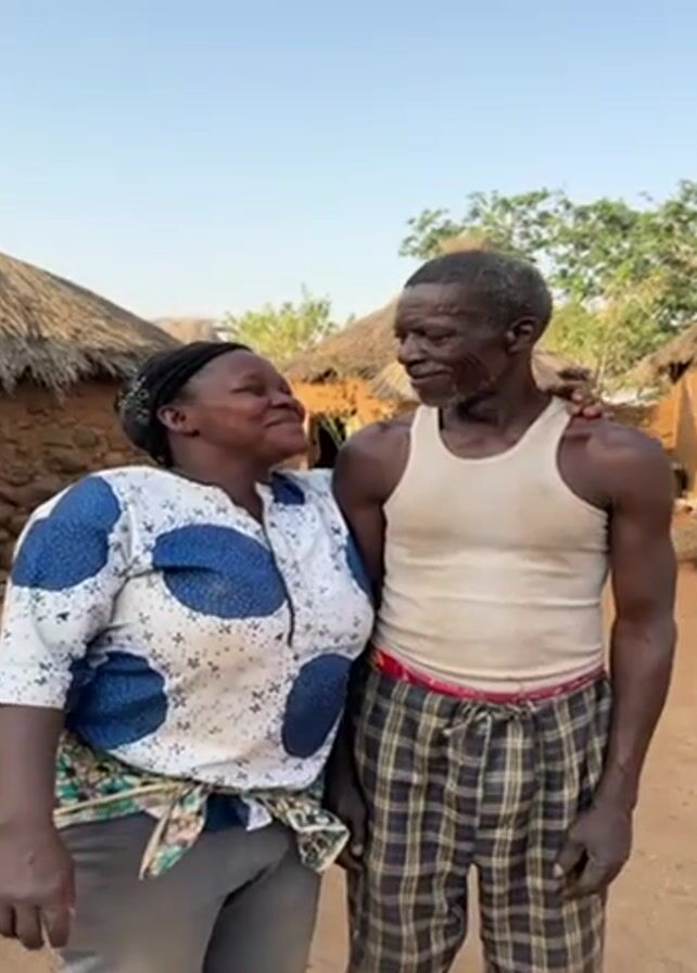 A middle-aged African woman stands close to an elderly African man, smiling up at him. They are both in an outdoor setting, possibly a village, with simple mud brick buildings with thatched roofs visible in the background. The woman is wearing a blue and white patterned shirt, dark pants, and a head covering. The man is wearing a white tank top and plaid pajama pants. The woman has her arm around the man's shoulder. The area around them appears to be a sandy or dirt surface.