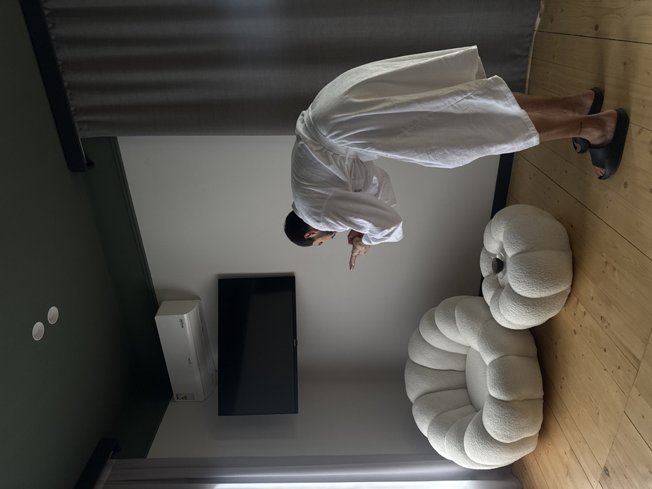 The scene depicts an indoor room, identified as being in Dilijan, Armenia. The room features light-colored wooden floorboards and white walls contrasting with a dark green ceiling, which has two recessed circular light fixtures. A black border runs along the intersection of the walls and ceiling. On the left wall, a white wall-mounted air conditioning unit is installed above a dark, wall-mounted flat-screen television. To the left of the television, a vertical grey curtain is partially visible. In the lower left quadrant of the image, two pieces of textured, cream-colored furniture are present: a large, low-profile armchair with a shell-like design, and a smaller, matching round ottoman positioned in front of it. A clear glass or plastic container with a dark liquid is placed on top of the ottoman. An adult male, with dark hair, is positioned on the right side of the frame, facing away from the camera and towards the left wall. He is wearing a white terrycloth bathrobe that extends to his mid-calves and dark slide sandals. His bare calves and ankles are visible, with a thin dark anklet on his right ankle. He is bent forward at the waist, with his arms raised and both index fingers extended forward and slightly downwards, as if pointing at or interacting with an unseen object directly in front of him, near the floor or ottoman. His mouth appears slightly open. A second grey curtain is visible along the right edge of the frame.