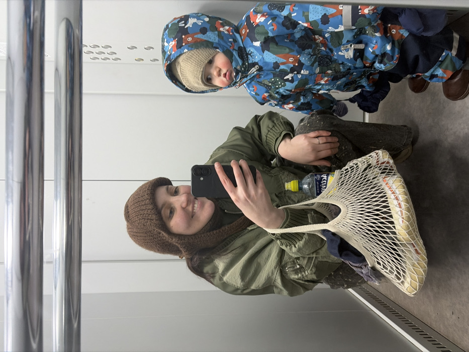 A mirror selfie taken inside an elevator in Chaikovsky, Russia, depicts an adult female and a young child. The adult, positioned in a crouch to the left, wears a brown knitted balaclava-style hat, an olive-green bomber jacket, and dark patterned trousers. She holds a black smartphone in her right hand, directed towards the mirror, and smiles. A silver ring is visible on her left ring finger. A cream-colored mesh bag hangs from her left arm, containing several elongated light-colored items (possibly bread) and a clear plastic bottle with a yellow cap, labeled "ACTIVIA". To the adult's right, a toddler stands, wearing a beige knitted beanie under a blue hooded winter suit patterned with trees and animals, dark blue gloves, and brown boots. The child's cheeks are flushed, and their gaze is directed slightly upwards and to the left. The elevator interior features light-colored paneled walls, reflective horizontal bars near the top, and a dark floor. A vertical panel with small reflective indicators, likely floor buttons or lights, is visible on the right wall.