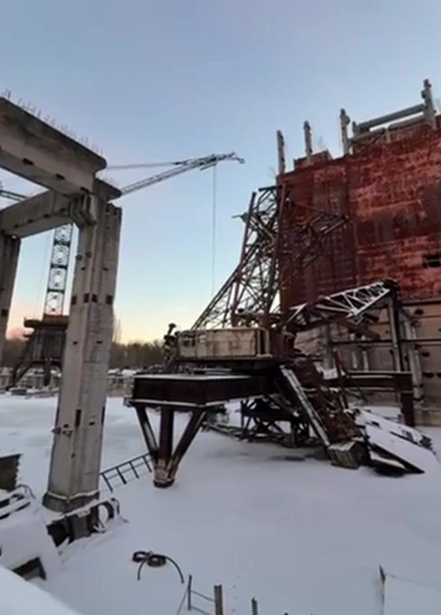 The camera pans up to reveal a snow-covered industrial wasteland. Large concrete structures stand tall, their skeletal remains exposed to the elements. A rusty, dilapidated building dominates the scene, its walls marked with decay and remnants of what once was. A network of metal cranes and scaffolding adds to the desolate atmosphere. The sky is a pale blue, hinting at the setting sun. The scene evokes a sense of abandonment and decay.