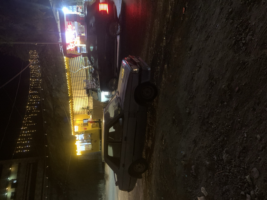 This image depicts a nighttime street scene in Ma'raba, Syria. The foreground consists of dark, unpaved ground with visible dirt, gravel, and scattered debris. A light-colored sedan, possibly light gray or blue, with a rear spoiler, is parked on the left side of the unpaved area, angled towards the right. Its front parking lights are illuminated. In the midground, a paved road is visible. A dark-colored SUV is in motion on the road, heading away from the viewer, with its distinctive red, L-shaped taillights brightly illuminated. Between the sedan and the SUV, a white utility van or pickup truck is stationary, facing right, with items visible in its bed. On the left side of the paved road, a brightly illuminated yellow food stall, partially branded "Friends," is visible. A solitary individual in red attire is discernible standing within or near the stall's entrance. Adjacent to the yellow stall, a longer commercial structure features a yellow and white striped awning and additional artificial lighting. Behind these structures, a dark hillside or natural rock face rises. Multiple strands of string lights with small yellow bulbs are suspended overhead, spanning across the street. A multi-story building is partially visible on the far left, with minimal internal illumination.