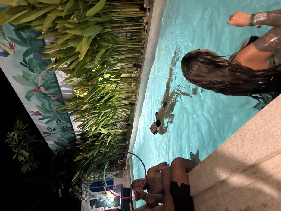 A group gathers around a brightly lit pool at night. Two people are in the water; one is fully submerged, while the other is swimming near the surface. A man is seen by the edge of the pool with a hula hoop. Lush greenery and a mural adorn the backdrop behind the pool.