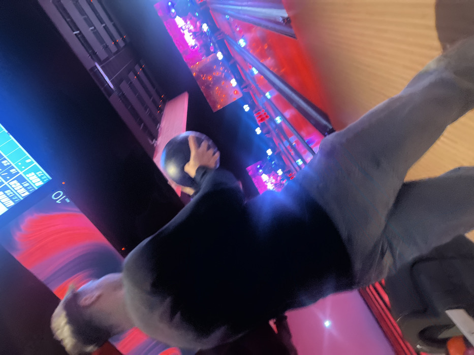 A person wearing jeans and a black shirt holds a bowling ball up and behind their head, presumably preparing to bowl. The scene is a bowling alley with bright, colorful lights and screens displaying scores and animations. The image is tilted. The bowler's face is visible, though slightly blurry.