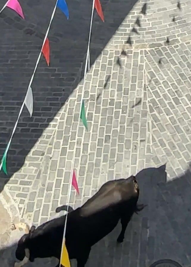 A black bull runs through a street decorated with colorful flags. The ground is covered in light-colored pavers. The bull runs past a shadow cast by a white tent or canopy. A person in white athletic shoes steps into the frame briefly. The camera focuses on the pavers and the decorations overhead as the bull moves through the area.