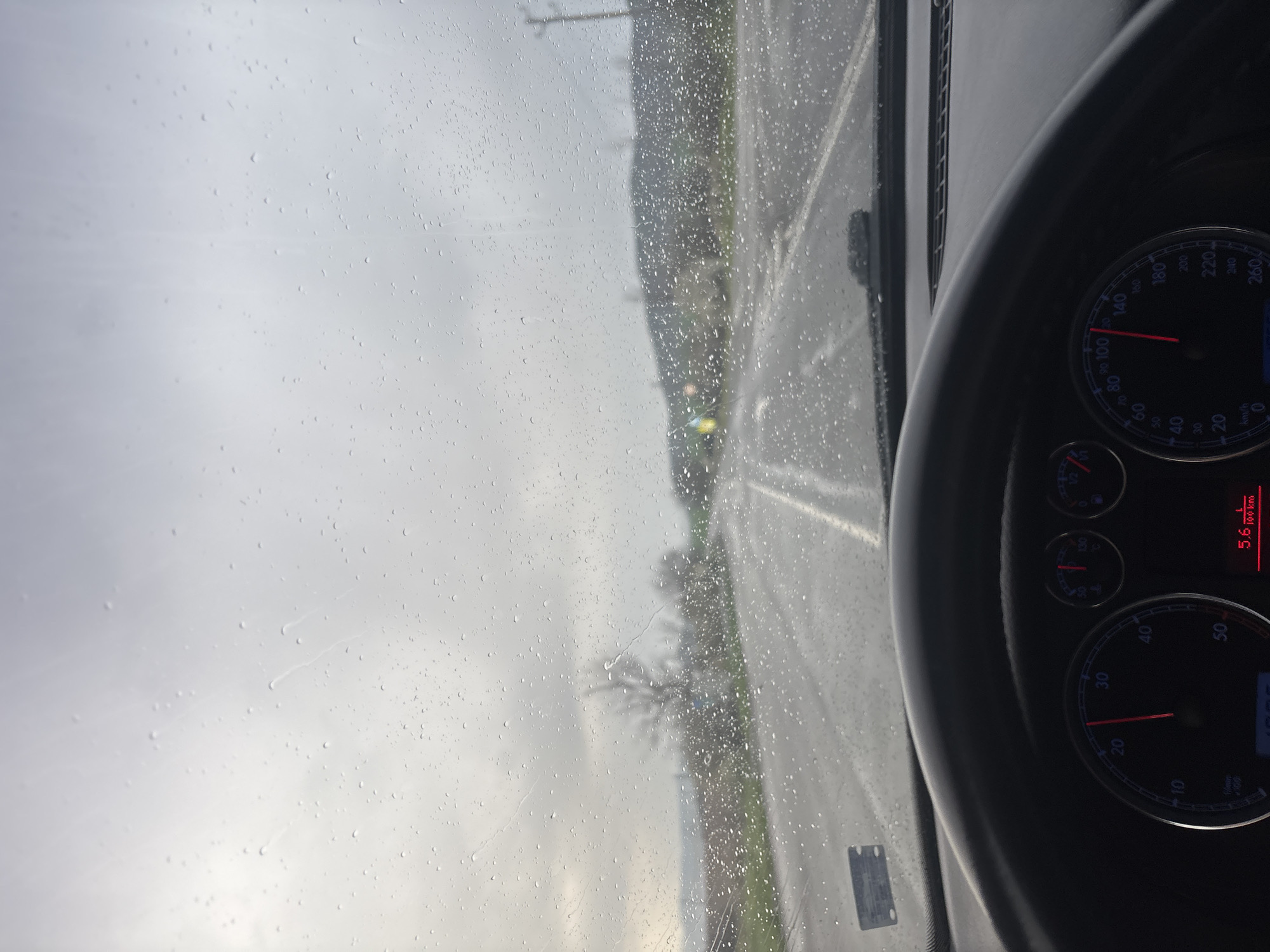 The image depicts a view from inside a car, looking out through the rain-streaked windshield
