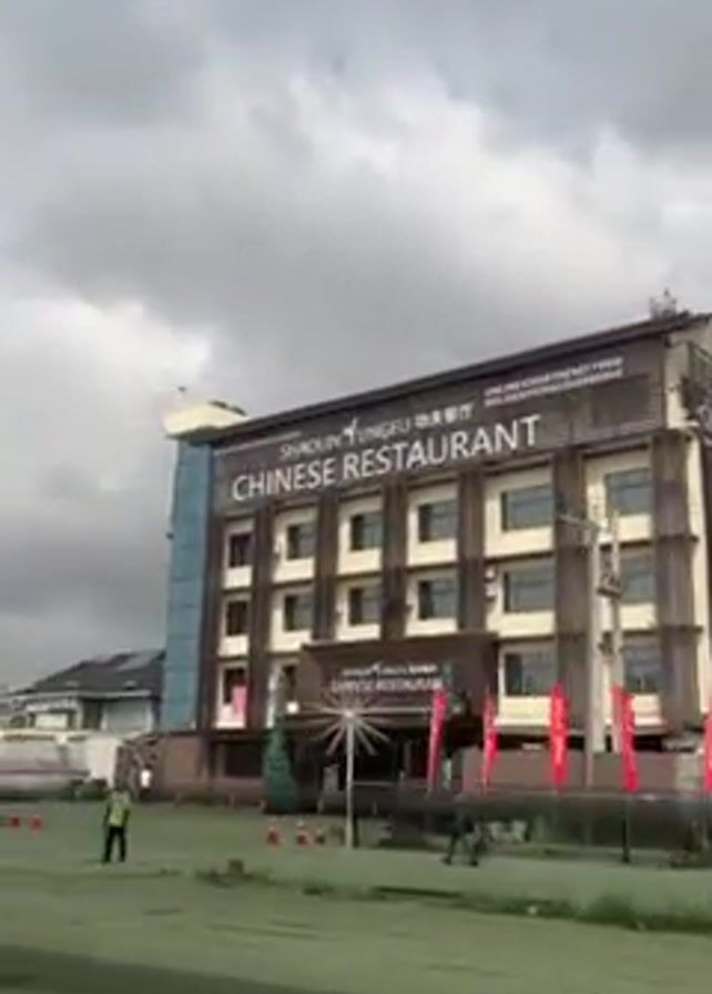 The video pans across a street scene on an overcast day. Initially, the camera focuses on a building housing the Shaolin Yungfu Chinese Restaurant. The restaurant appears to be multiple stories tall, with a mix of tan-colored walls and a section with blue glass windows. There are several red banners in front of the entrance. A man wearing a yellow shirt and carrying a stick walks by. The camera then pans to the left, showing a scooter with two people on it moving on the pavement. Finally, the camera continues to pan left, showing a wide street with houses on the other side and a man walking across the street. The sky is cloudy and grey throughout the video.