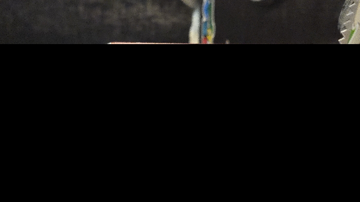 The scene is depicted in a very dark, obscured setting, with the majority of the frame being solid black. A narrow vertical portion on the right reveals a dark, textured background. Centered horizontally within this visible strip is a blurred object displaying distinct segments of red, yellow, blue, and green colors. Below this, at the bottom edge, a light-colored object with multiple sharp, uniform serrations along its edge is partially visible. No human figures or discernible actions are present. The location for this scene is Lompoc, United States.