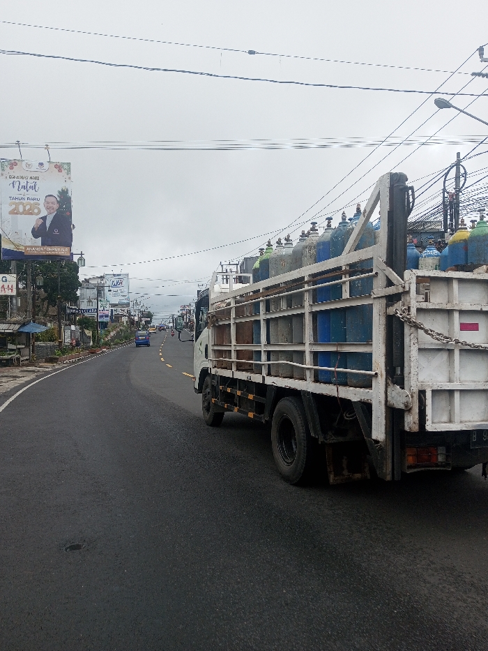 The scene captures a street view under an overcast sky, in the city of Serpang Shalli, Bhutan. A white flatbed truck, laden with numerous industrial gas cylinders of varying colors including blue, grey, green, and yellow, occupies the right lane of a paved, two-lane road. The truck is positioned with its rear visible, moving away from the viewer. The road exhibits a slight curve to the left and is marked by a double yellow solid line in its center. Along the left side of the road, multiple commercial billboards and banners are erected. One prominent billboard features a smiling man in a blue suit alongside text, which includes "Selamat Natal & Tahun Baru 2025" and "Ananda Tohiron HLP" in Indonesian. Further down the road, a blue car is visible, along with other distant vehicles. The roadside is lined with buildings, streetlights, and utility poles heavily tangled with electrical wires, particularly noticeable behind the truck on the right. No identifiable individuals are clearly depicted.
