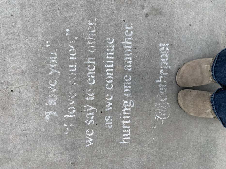 A section of concrete sidewalk or pavement is stenciled with a text in white. The text reads: "I love you. 'I love you too,' we say to each other, as we continue hurting one another." Below this, the text "@jdethepost" is stenciled, and a chalk drawing of what looks like a compass points to it. The lower portion of the frame shows a person's feet in tan moccasin-style shoes and blue jeans standing on the sidewalk.