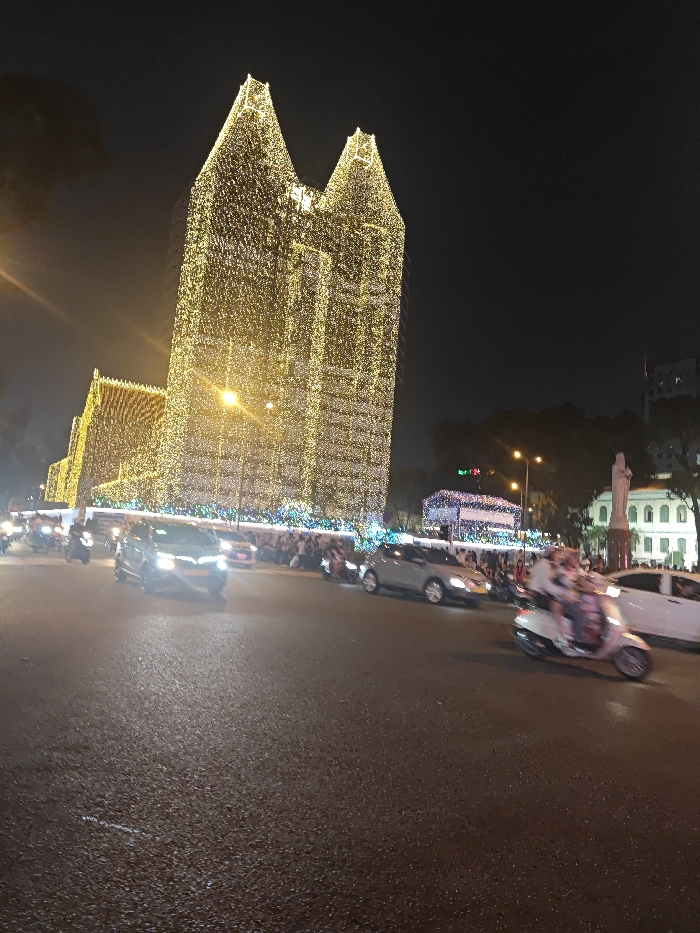 The image depicts a vibrant night scene in Ho Chi Minh City, prominently featuring the Landmark 81 skyscraper, which is located in the Bình Thạnh District, not Thủ Đức. The towering structure is extensively adorned with thousands of warm-toned LED string lights, creating a shimmering, golden effect across its entire facade, including its two distinctive pointed spires. In the foreground, a multi-lane asphalt road carries active traffic. Vehicles include several cars with illuminated headlights, such as a dark sedan prominent on the left and a silver sedan further right, appearing slightly blurred from motion. Multiple motorbikes are also present, with a light-colored scooter carrying two riders captured in motion on the right side of the frame. Along the base of the skyscraper, a dense crowd of people is gathered on a promenade or sidewalk, appearing to observe the illuminated edifice. To the right, in the mid-ground, a white building with classical architectural elements and a prominent white statue, likely religious, is partially visible amidst dark foliage under additional street lighting. The sky above is dark, indicating nighttime conditions, with a few distant lights from other buildings visible.