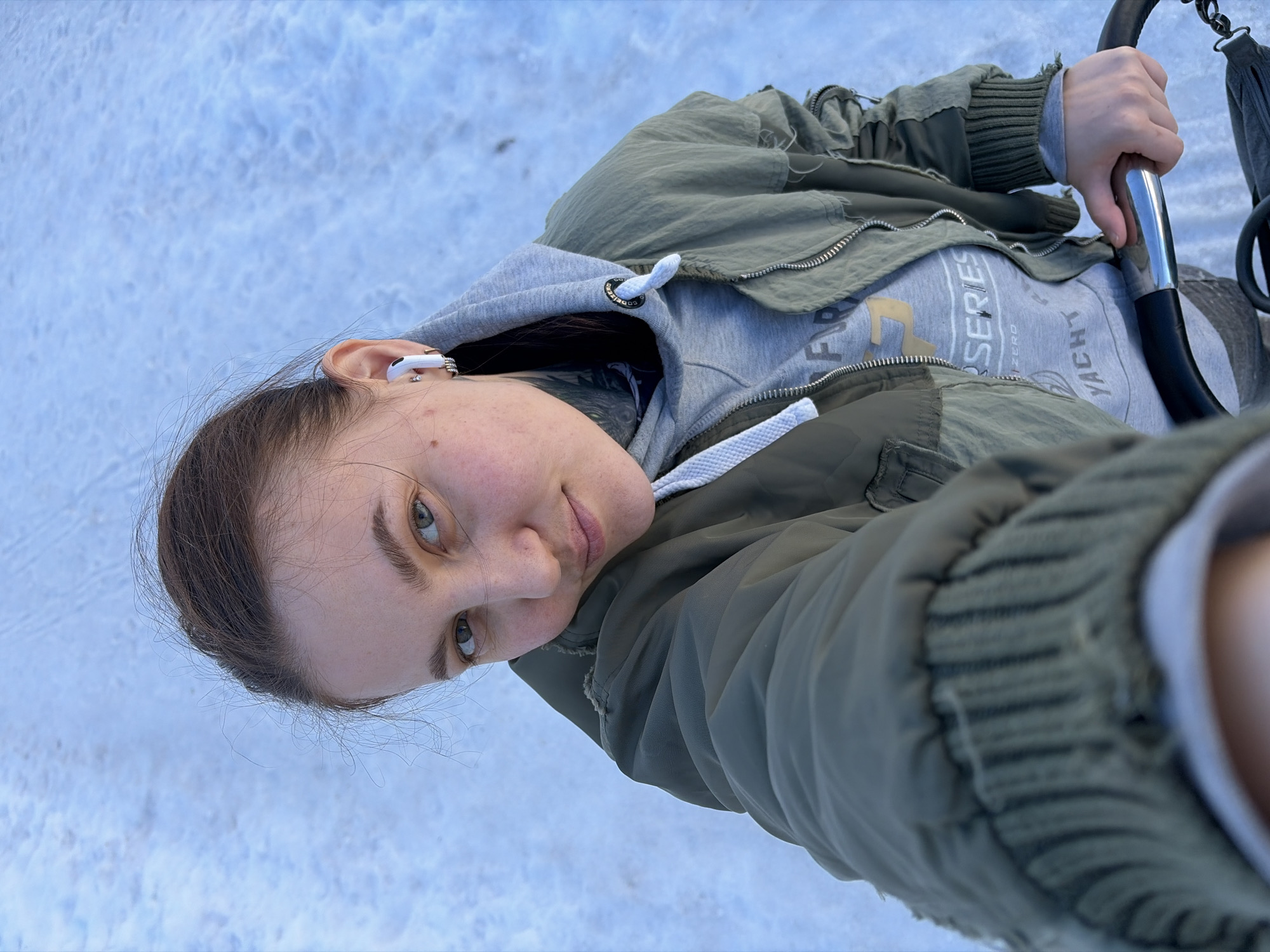 A young adult woman is depicted in a selfie, captured outdoors in a snowy environment in the city of Chaikovsky, Russia
