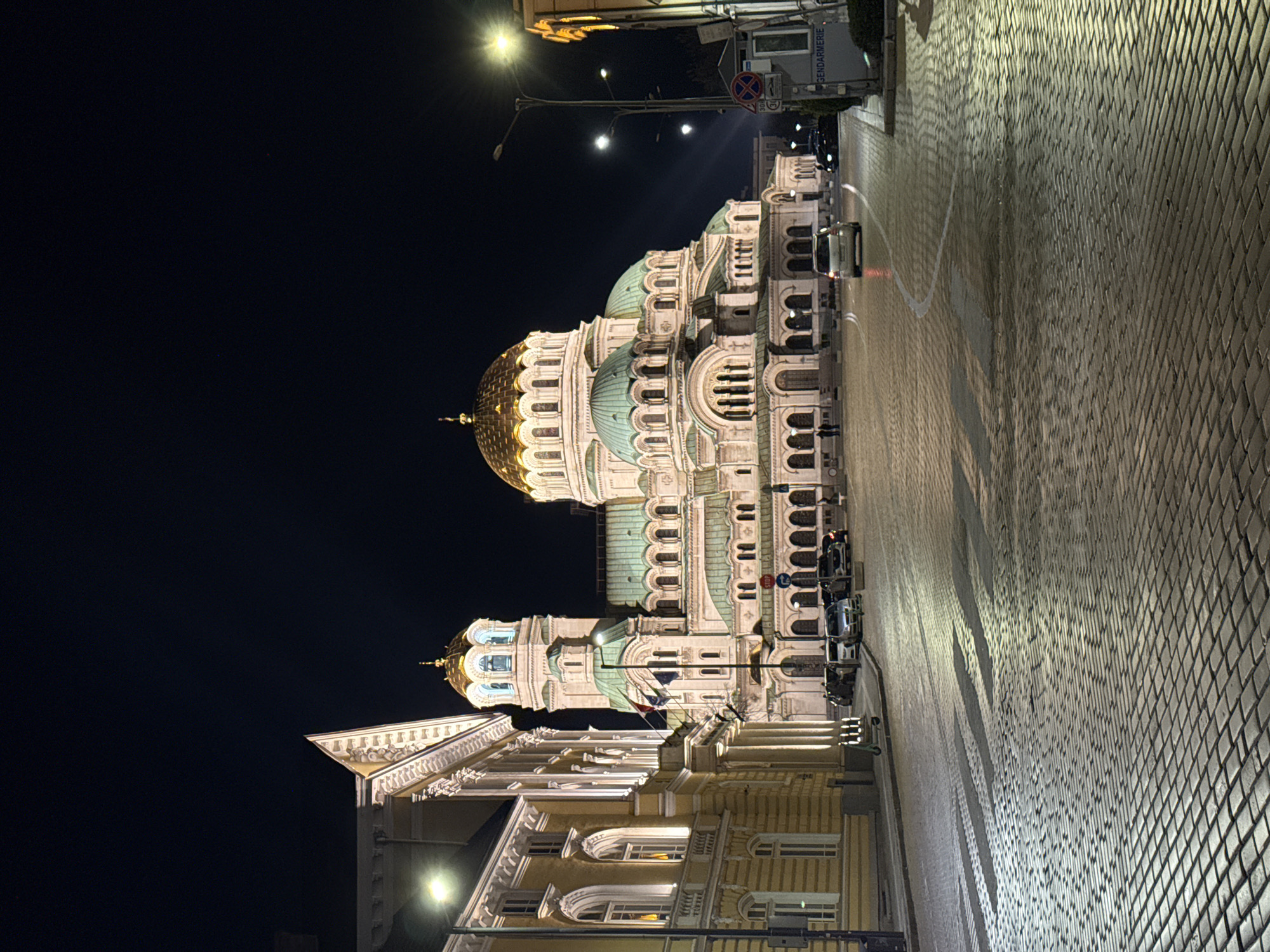 Alexander Nevsky Cathedral in Sofia, Bulgaria, at night. The cathedral's domes are illuminated, with one dome having a golden surface. The building is highly detailed with multiple arches and decorative elements. To the right of the cathedral is a paved street, illuminated by streetlights, with parked vehicles. The sky is dark. There are other buildings adjacent to the cathedral, which also appear to be lit.