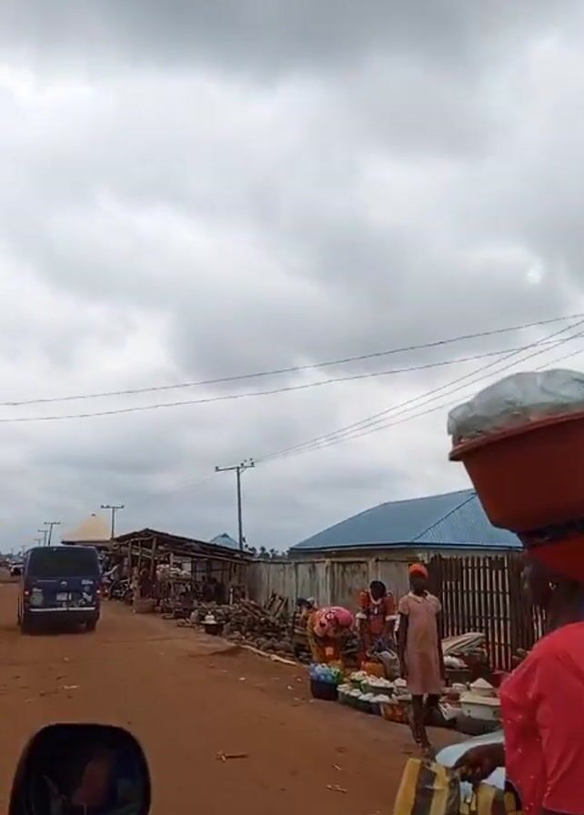 The video presents an outdoor scene of a market in what appears to be a rural African setting. The camera is situated inside a moving vehicle, offering a view through the windshield and occasionally capturing the side mirrors. The road is unpaved and reddish-brown. On either side, market stalls and individuals are present, selling goods. A woman is seen carrying a large container on her head. Other people are seen walking, sitting, and engaging in market activities. There are also cars and a van, suggesting transportation is active. The sky is overcast with a gray cloudy atmosphere. Power lines run overhead. In one of the side mirrors, an image of a person's face can be seen pasted on what looks like newspaper or a political campaign poster. The camera moves forward slowly, navigating the market area.