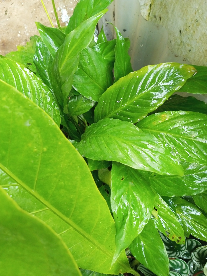 The image captures a vibrant cluster of glossy, green leaves. The leaves vary in size and shape, some broad and rounded, others elongated and pointed. Water droplets adorn several surfaces, adding a glistening texture. A hint of a light-colored wall or surface is visible in the background, alongside a few circular, patterned leaves partially visible at the bottom. The overall impression is one of lushness and freshness.