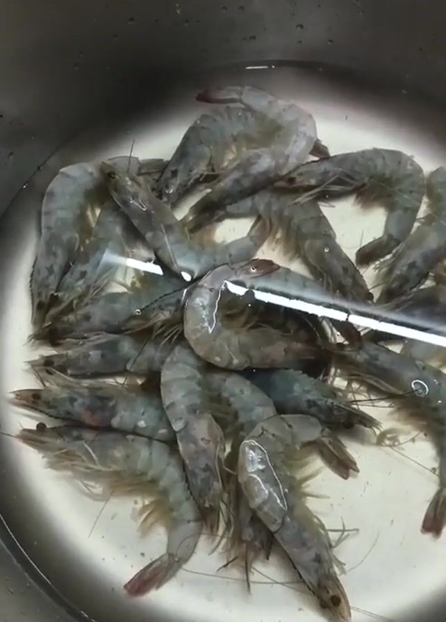 raw shrimp being rinsed in a stainless steel sink with water. A few shrimp are then transferred to a stainless steel pot. The scene shifts to a preparation area with two heads of garlic and a pair of small scissors.