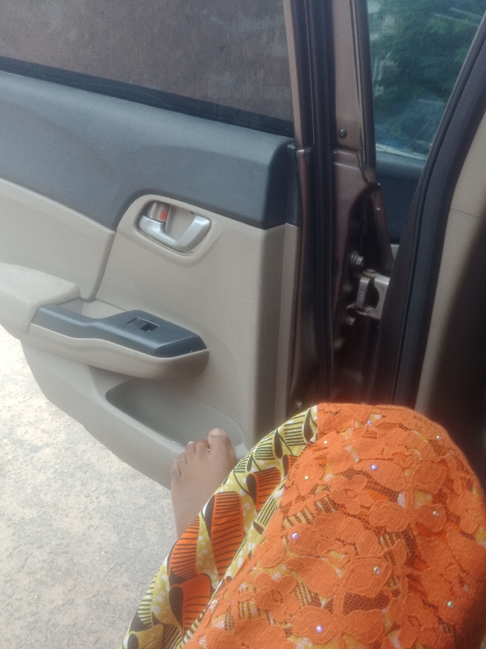 A close-up, internal perspective of a vehicle's right-side passenger door, currently open, in Giginyu, Nigeria. The car door panel is two-toned, with a dark gray upper section and a lighter beige/tan lower section. It features a silver-colored interior door handle with a red lock indicator. Below the handle, a black armrest/pull handle is visible, incorporating a recess for window controls. A shallow storage compartment is present at the bottom of the door panel. The car's dark brown/bronze door frame and hinge mechanism are visible. A person's bare right foot is positioned near the lower part of the door panel. The individual is wearing a lower garment with a pattern of yellow, black, and orange geometric shapes, partially covered by an overlay of orange lace fabric adorned with small, reflective embellishments, visible over the thigh area. The exterior ground appears to be a light-colored, textured surface, possibly paved, and blurred greenery is visible through the open door and tinted window in the background.