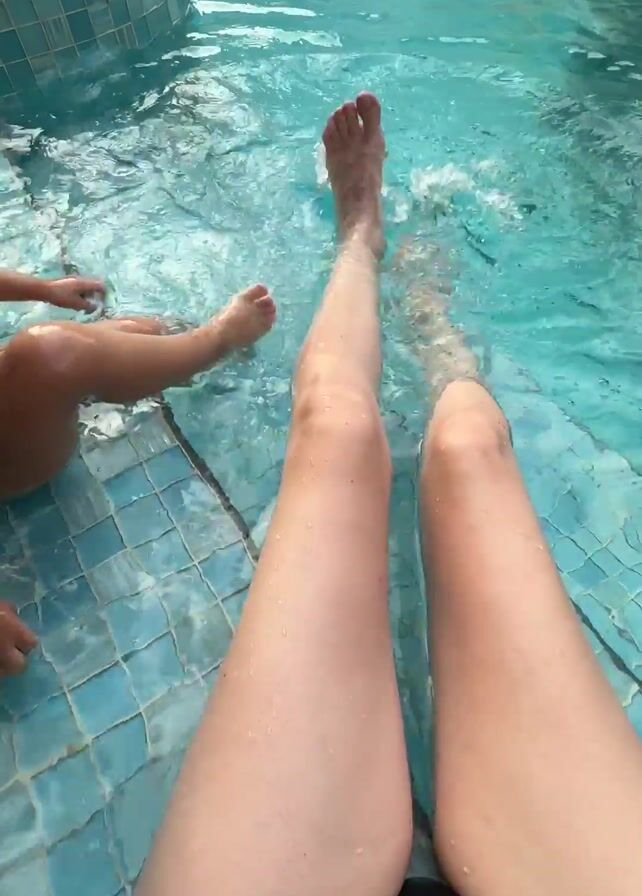 A first-person perspective shows two people sitting on the edge of a blue-tiled pool, their legs dangling in the clear water