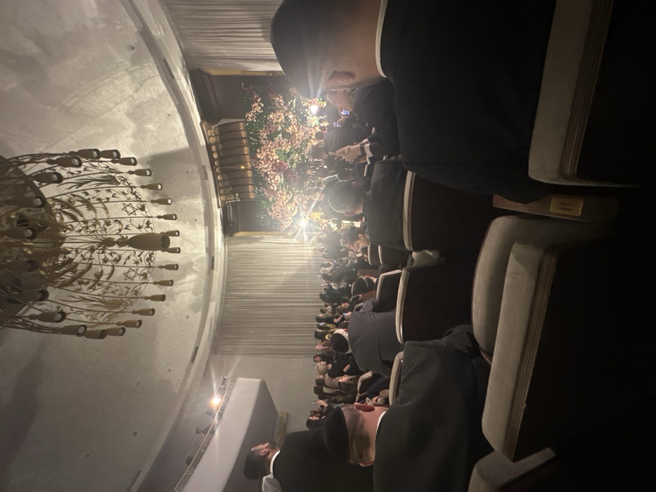 An audience is seated in rows of cushioned chairs, mostly facing forward. The people appear to be dressed in dark clothing, likely suits. A chandelier with ornate metalwork hangs from the ceiling. There is a floral arrangement at the front of the room. The lighting is somewhat dim, creating a sense of formality and occasion.