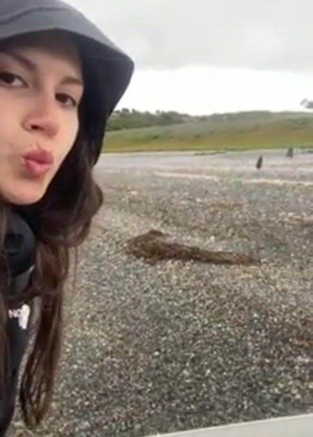 A woman wearing a black hooded raincoat stands in front of a grey beach, smiling at the camera. She has long brown hair. In the distance, several dark shapes, possibly penguins, stand on the pebble-covered beach. The sky is overcast and grey. In the foreground is a low wall or barrier. There is driftwood on the beach.