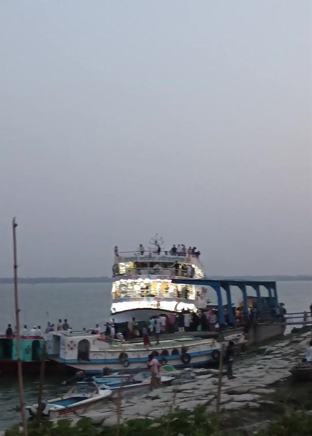 busy waterfront scene in an overcast setting. A large, multi-decked boat, brightly lit, is docked, with people gathered on its various levels and around the gangway. Several smaller boats are also present, docked nearby or floating in the water. People are milling about on the pier and along the shoreline, suggesting a transportation hub or a popular gathering spot. The environment is typical of a riverside location with greenery along the bank.