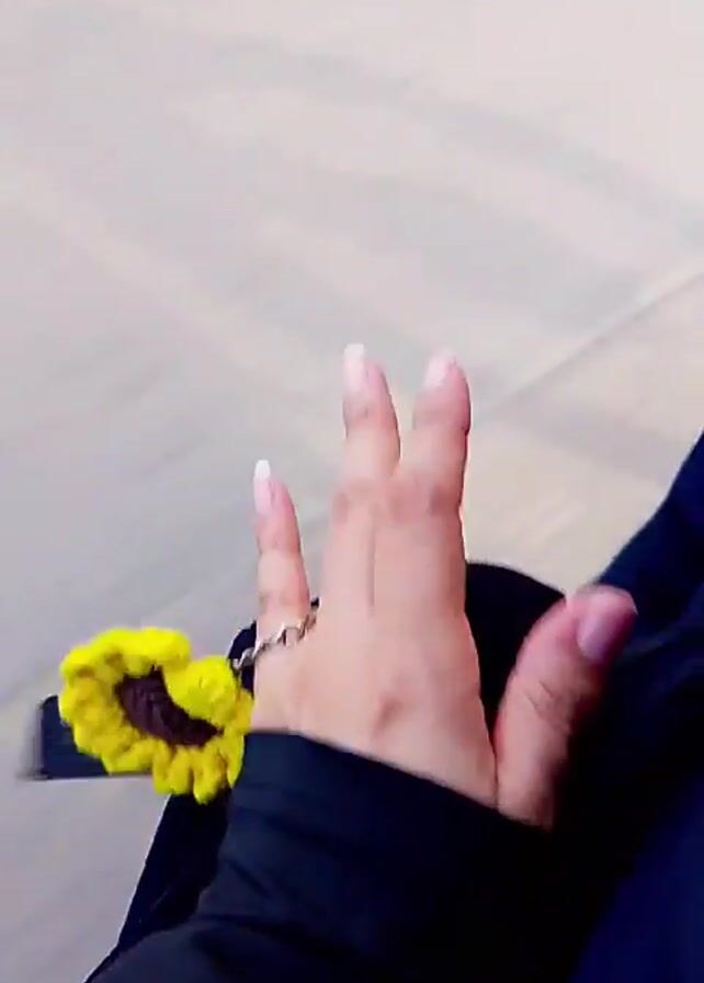 person's hand, with neatly manicured fingernails, wearing a silver ring connected to a small, crocheted sunflower. The person is wearing a black long-sleeved shirt and blue pants. The background is a blurred, light grey surface that appears to be the ground, suggesting the person is moving. The video is shot from a first-person perspective, looking down at the person's own hand.