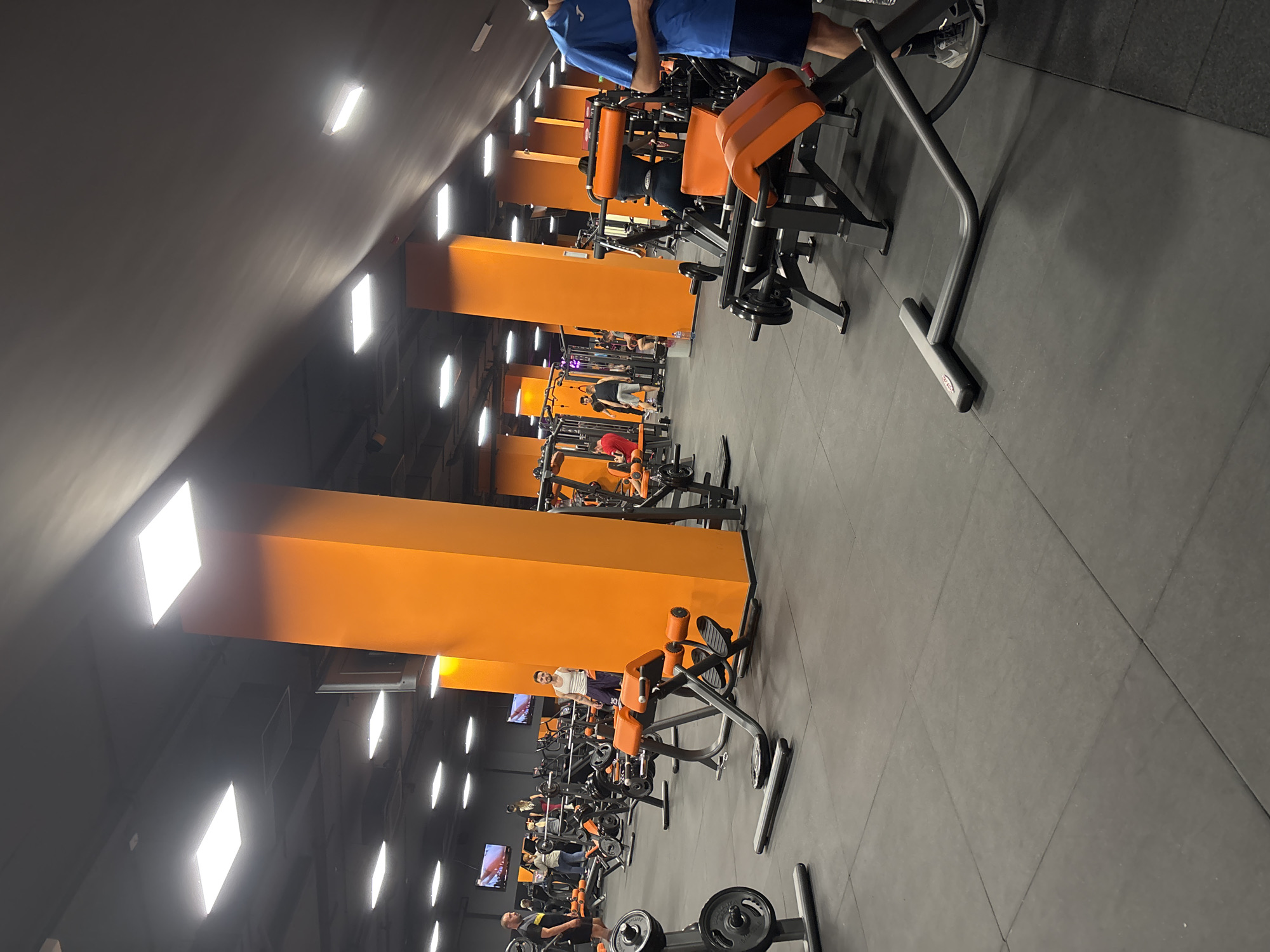 The image depicts the interior of a gym in Plovdiv, Bulgaria. The gym is well-lit with overhead fluorescent lights and features orange support columns. Multiple weight training machines are present and in use by several individuals. The floor is black, likely a rubberized material to absorb impact. People are actively exercising on the equipment.