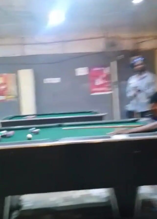 Two men are playing pool in a game room with two tables. One man is leaning over a table, aiming the cue stick, while the other stands behind him, holding his own cue stick and watching. The tables are green and black, and several balls are on the table in play. There are posters on the gray walls, and a fan is rotating in the background. The room is dimly lit, with a tiled floor and what appears to be a corrugated metal roof.