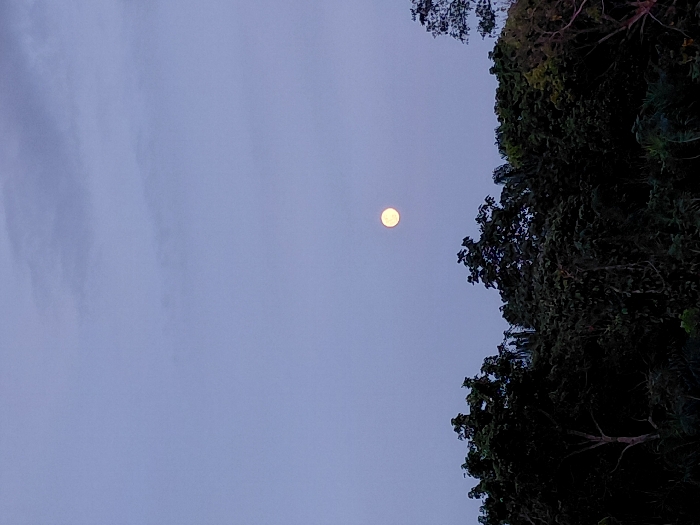 The image depicts a twilight or nighttime scene in Blang Pohroh, Indonesia. The upper two-thirds of the frame features a pale purple-blue sky with faint, wispy clouds. A prominent, bright, and circular full moon is centrally positioned in the upper half of the sky. The lower third of the image is dominated by a dense, dark green canopy of tropical trees and foliage, appearing as a silhouette against the lighter sky. No individuals, animals, or man-made structures are visible in the scene.