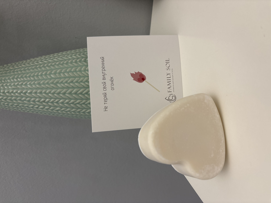 The scene, located in Myaglovo, Russia, depicts an indoor arrangement of objects. In the foreground, an off-white, heart-shaped object, consistent with a bar of soap or wax, exhibits a slightly textured or frosted surface as it rests on a smooth, white horizontal platform. Directly behind this object, a white square card stands upright. The card displays black Cyrillic text at the top: "Не теряй свой внутренний огонёк" (Don't lose your inner spark). Below the text is a stylized graphic of a red and orange burning matchstick. At the bottom of the card, the logo "FAMILY SOIL" is printed in black, accompanied by smaller Cyrillic text: "АРОМАТЫ ДЛЯ ДУШИ И ТЕЛА" (AROMAS FOR SOUL AND BODY). Partially visible behind the card and to its right is the upper section of a light teal or mint green decorative object, likely a ceramic vase, characterized by a distinct vertical braided or cable-knit texture. The background consists of a plain, light grey wall. No individuals are present in the image.