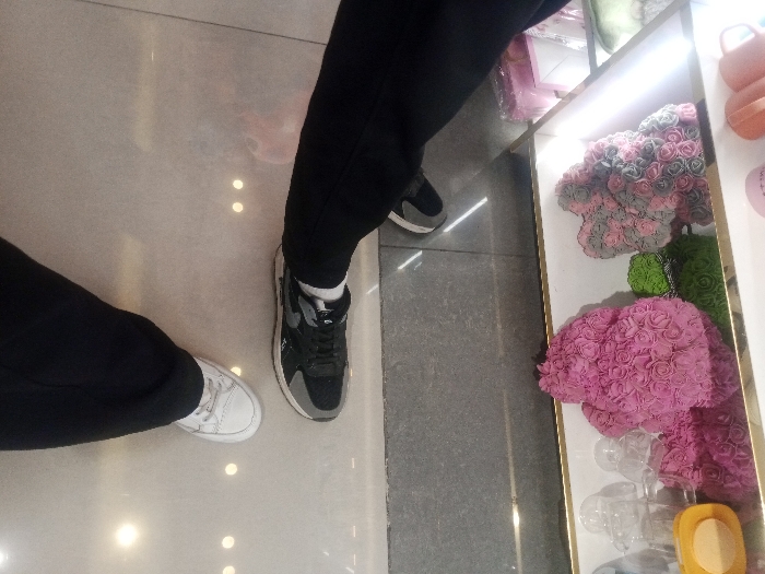 The image presents an overhead view of the lower legs and feet of two individuals standing on an indoor tiled floor next to a retail display case. The floor on the left consists of light-colored, reflective tiles exhibiting multiple bright, circular light reflections. The floor on the right is a darker grey tile. One individual, positioned on the left, wears black trousers and white low-top sneakers. The second individual, on the right, wears black trousers, white socks, and black and grey high-top athletic sneakers featuring white soles and a visible sports brand logo on the side. To the right of the individuals is a white display case with gold-colored trim, containing various retail items. Notable items include multiple decorative objects crafted from artificial roses: a bear-shaped item composed of grey and pink roses, and several heart-shaped items made of bright pink and green roses. Clear plastic containers or cups are also visible below these rose arrangements, along with a partially visible orange and beige object. The setting is consistent with a retail environment, such as a gift shop or a commercial mall.