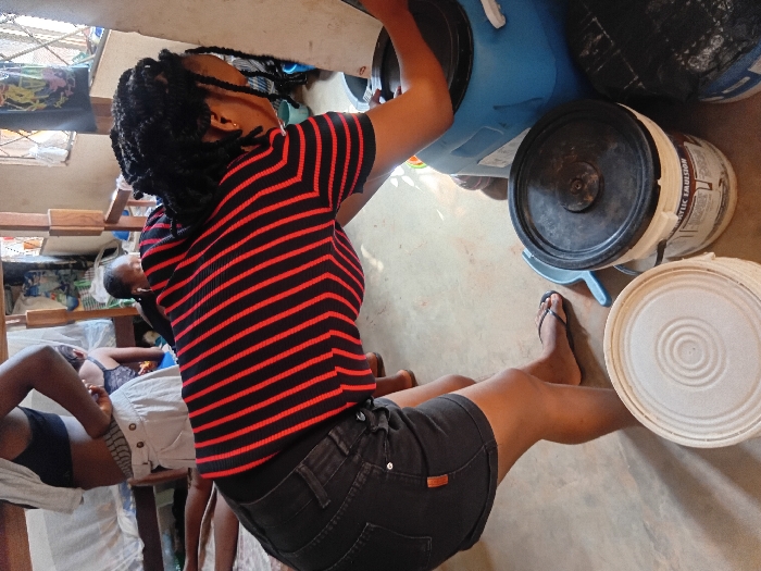 The scene depicts an indoor environment in Ejule, Nigeria, likely a communal living space or dormitory. In the foreground, a dark-skinned individual with braided hair, wearing a red and black striped shirt and black denim shorts with flip-flops, is bent over, examining or interacting with the contents of a blue plastic drum with a black lid. Nearby on the light-colored concrete floor are two white plastic buckets; one is labeled "ACRYLIC EMULSION" and has a black lid, while the other, stacked, has a white lid with concentric circles. A light blue plastic scoop rests on the floor between the buckets. In the mid-ground, to the left, another individual is partially visible, standing near a wooden bunk bed. This person wears a dark bra top and light-colored shorts or a skirt, with a white cloth draped over their shoulder. Behind them, a third individual is indistinctly visible near the lower bunk. Further in the background, another person is partially visible near a second bunk bed. The room features wooden bunk beds with white mattresses and bedding. Natural light enters from windows fitted with bars, from which dark fabric items are suspended. The walls are light-colored, and the overall setting appears functional and lived-in.