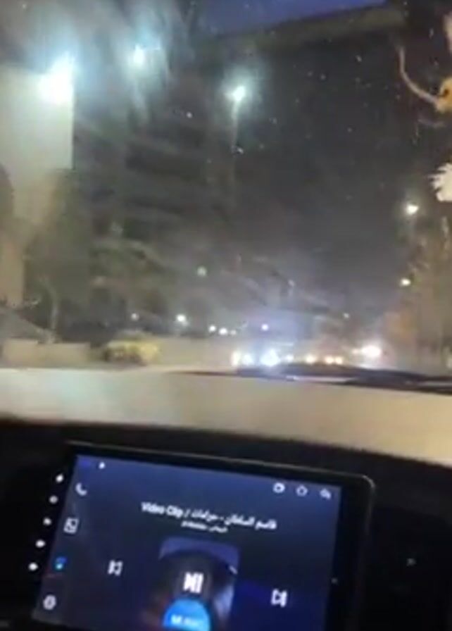 A view from inside a car driving down a street at night. The car's dashboard and infotainment screen are visible, displaying music by Qasim Sultan. Streetlights illuminate the wet road and tall buildings line the street. Other cars can be seen driving in both directions.