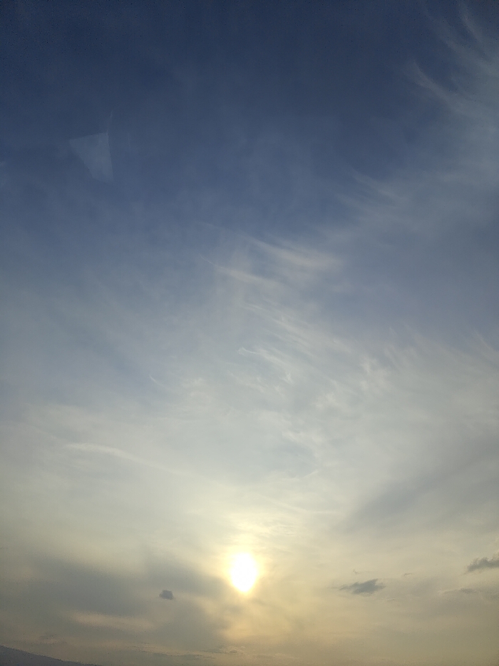 The image displays a celestial scene, likely a sunrise or sunset, over the city of Sofia, Bulgaria. A brilliant, circular sun, appearing as an intense white-yellow orb, dominates the lower-left-center of the frame. The sky transitions from a deep blue at the top, fading to lighter blue-grey, and then to a luminous yellow-orange around the sun. High-altitude, wispy cirrus clouds are scattered across the upper sky, while more diffused cloud formations are visible mid-frame, illuminated by the sun. Darker, indistinct cloud masses are situated closer to the lower horizon. A faint, dark line at the very bottom suggests a distant landscape or urban edge. Reflective, angular artifacts are evident in the upper-left quadrant, consistent with the photograph being taken through a glass window. No identifiable individuals, specific man-made structures, or distinct actions are present.
