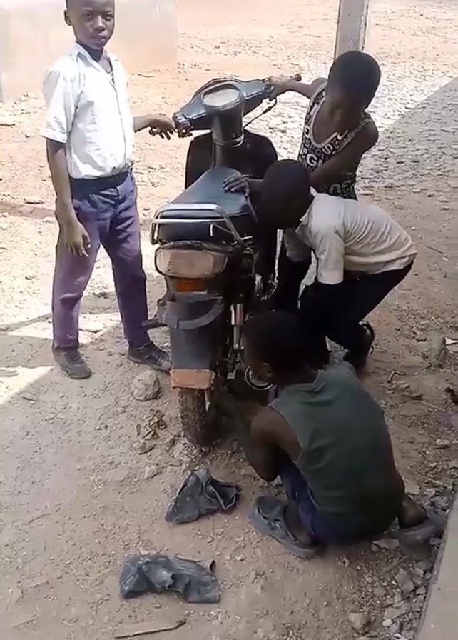 Four young boys are working on a motorcycle in an outdoor setting. One boy is standing to the left, dressed in a white shirt and dark pants. Another boy stands on the right, wearing a tank top and dark pants. Two other boys are crouched down by the rear of the motorcycle, one in a white shirt and the other in a green tank top. The motorcycle is black and appears to be in need of repair. Tools and dirty rags are scattered on the ground near the boys. The setting looks like a schoolyard or a similar outdoor area, with a building visible in the background. The video is taken with a Tecno Pova phone, as indicated by the watermark.