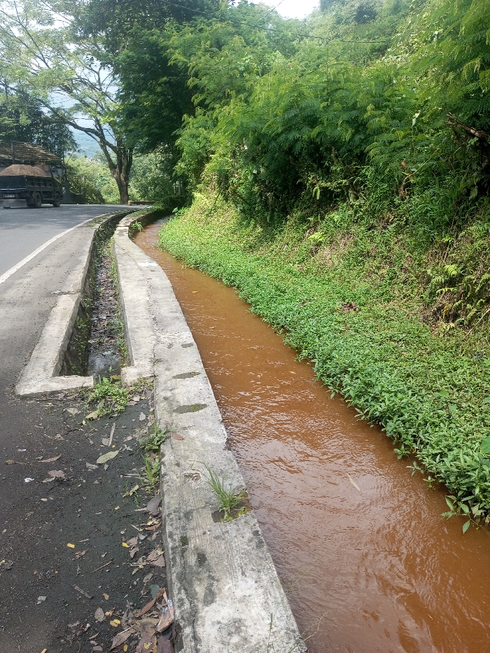 This image depicts a roadside scene in Kandapola, Sri Lanka. A concrete-lined channel containing flowing, turbid reddish-brown water occupies the midground. To its immediate left, a weathered grey concrete curb separates the channel from a narrower, shallower concrete drainage ditch, which contains dark water and organic debris. Adjacent to this ditch is a dark asphalt road, exhibiting scattered leaves and dirt. In the upper-left background, the rear section of a dark-colored truck, laden with a light-colored mound of material, is partially visible on the road. Beyond the road, large trees with bright green foliage are present, with distant hills visible under a bright sky. The embankment on the right side of the water channel is densely covered with low-lying green herbaceous plants at the water's edge, transitioning upwards into a steep slope heavily vegetated with various trees and shrubs. No persons are present.