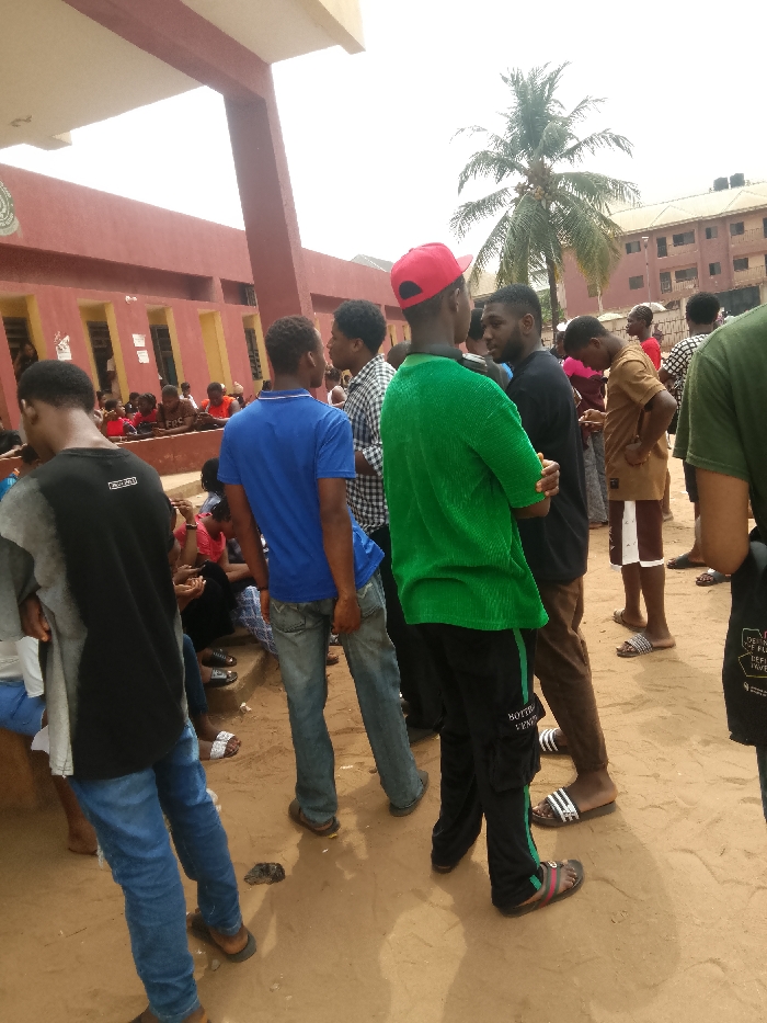 The scene depicts an outdoor gathering of approximately twenty individuals, predominantly young males, in Umuokpu, Nigeria