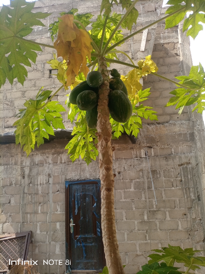 An outdoor, eye-level photograph captured in the city of Unknown, Unknown, depicts a papaya tree with unripened fruit in front of a concrete block wall. The central subject is a brown-trunked papaya tree, bearing a cluster of approximately eight to ten green, unripened papayas directly on its upper trunk. The tree's large, palmate leaves are predominantly green, with several upper leaves appearing yellowed and dried. Behind the tree, a building wall constructed from light gray concrete blocks exhibits vertical dark streaks indicative of moisture or weathering. A dark blue door, seemingly wrapped in torn blue plastic sheeting and equipped with a silver-colored handle, is set into the concrete wall in the lower-middle background. To the lower left, a portion of a rusted metal grate or frame is visible. The scene is brightly illuminated by daylight, suggesting an outdoor environment on a clear day. The text "Infinix NOTE 8i" is overlaid in white in the bottom left corner. No individuals or active interactions are present.