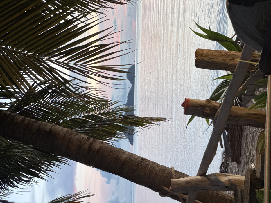 The image depicts a tranquil coastal scene in Baan Sri Thanu, Thailand, viewed at dusk or dawn. The foreground features the base of a large palm tree, its dark trunk angled from the upper left towards the lower left. Palm fronds extend from the upper left and upper right, partially framing a pastel-colored sky with light blue, pink, and faint orange hues. Below the palm, a rustic wooden fence traverses the lower mid-ground. This fence consists of vertical logs and horizontal wooden rails; one central log has a red-orange marking on its top surface, and another to its left has a rope wrapped around it. Green foliage is visible behind and around the fence posts, and a strip of sandy beach is visible immediately behind the fence. The calm, reflective ocean fills the middle ground, extending to a distant horizon. Two dark, tree-covered islands or landmasses are silhouetted against the sky on the horizon line. No people are present. A dark, soft object is partially visible in the extreme lower right foreground.